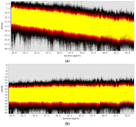 Figure 5a shows the relationship between the backscattering coefficients and incidence angles of the pixels in Figure 4a. There are three colors in the figure, each representing the density of points. The yellow area represents the densest concentration of points, followed by the red area, and the black area has the least number of points distributed. It can be seen from the figure that there is a negative correlation between the incidence angle and the backscattering coefficient, and the backscattering value σ decreases with the increase in the incidence angle. The backscattering value σ0 after decibelization has a certain linear relationship with the incidence angle. The decibelization formula is shown in Equation (2) [16]: