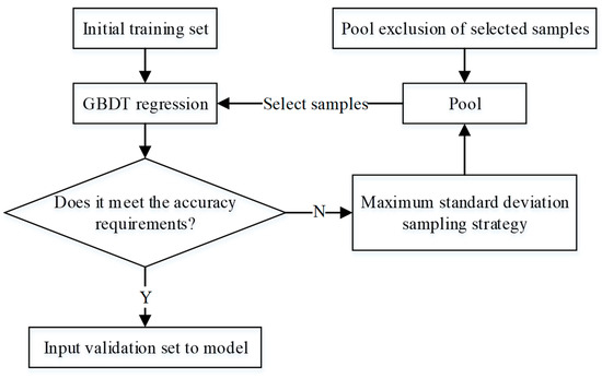 - From the training set, 30% of the samples are randomly selected and used to train the GBDT model, thereby generating the initial model. The remaining 70% of the training set samples are used as a pool for sampling.