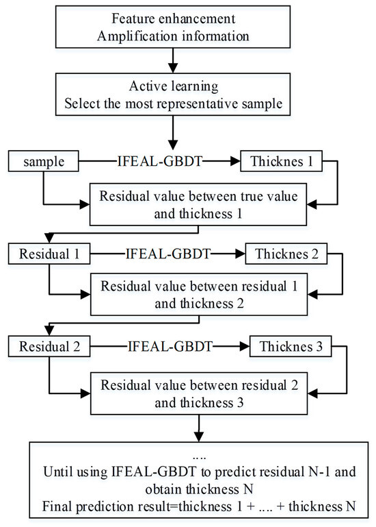 The entire IFEAL-GBDT process is based on using feature enhancement to amplify information, then using active learning to select samples based on amplification information, and finally using the GBDT model for training and prediction. As shown in Figure 7, first, a regression tree model is randomly initialized, and the model is used to predict the training set. Based on the prediction results, the residual value of each sample is calculated (i.e., subtracting the predicted value produced by the current model from the true real value). Then, in the next step, the residual is considered the new true value, and training is performed to calculate the residual value, repeating this process. In each iteration, the tree learns to fit the missing content of the previous model, known as residuals, in order to minimize the final prediction error.