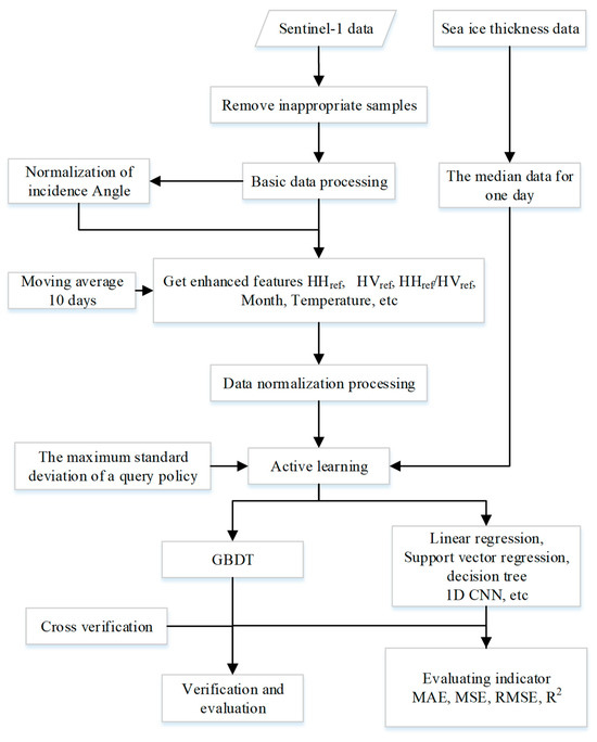 Based on the above studies, in order to make full use of the features of sea ice remote sensing images and further improve the accuracy of sea ice thickness inversion, in this paper, we propose a method of integrating active-learning and feature-enhancement strategies for sample selection and feature enhancement, combined with a Gradient Boosting Decision Tree (GBDT) for sea ice thickness inversion, namely Integrated Feature-Enhancement and Active-Learning Strategies for GBDT(IFEAL-GBDT). Firstly, SAR image preprocessing and incidence angle normalization were performed to obtain normalized HH and HV characteristics. Then, the enhanced features, such as the polarization ratio and normalized difference, which are more sensitive to sea ice thickness changes, were obtained via formula calculation. Considering the influence of incidence angle on SAR data and the influence of the environment on sea ice thickness, the properties of incidence angle, sea water temperature, and time (month) were added to construct different feature vector combinations to enhance the separability of different sea ice thicknesses. In addition, the active-learning strategy based on the maximum standard deviation was studied. We took advantage of the following characteristic: the greater the information entropy, the higher the uncertainty of the samples, and the more representative samples with more information that will be selected. This affordance solves the problem wherein it is difficult to improve the accuracy of sea ice thickness inversion when the sample size is small and there is anomaly interference. Finally, combined with the GBDT method’s strong fitting ability for high-dimensional data and problems with complex feature relationships, each decision tree was used to select the best features for segmentation, more valuable sea ice feature information was mined from different feature combinations, and sea ice thickness was inverted by integrating the results of multiple decision trees. Compared with other typical sea ice thickness inversion methods, the IFEAL-GBDT method proposed in this paper achieves higher inversion accuracy.