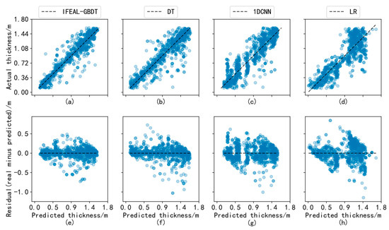 Analysis of the experimental results for IFEAL-GBDT, DT, 1DCNN, and LR. (a) Scatter plot of predicted and true values of IFEAL-GBDT; (b) scatter plot of predicted and true values of DT; (c) Scatter plot of predicted and true values of 1DCNN; (d) Scatter plot of predicted and true values of LR; (e) Scatter plot of predicted and residual values of IFEAL-GBDT; (f) Scatter plot of predicted and residual values of DT; (g) Scatter plot of predicted and residual values of 1DCNN; (h) Scatter plot of predicted and residual values of LR.