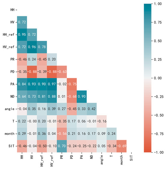 Here, PR is the polarization ratio, PD is the polarization difference, PA is the polarization addition, ND is the polarization normalization difference, T is the seawater temperature, and angle is the local incidence angle. The lighter the color, the lower the correlation, with blue representing a positive correlation and red representing a negative correlation. Among them, PR and month have the best correlation with thickness value, and the correlation coefficient is 0.7, which is a strong correlation. HH and HHref are generally negatively correlated with thickness values, and the corresponding correlation coefficients are −0.46 and −0.5, respectively, indicating a moderate correlation. It can be seen that there is an influence of the incidence angle, and the HHref has a higher correlation than the unnormalized HH. For the variation in the surface roughness of ground objects, co-polarized HH is more sensitive than cross-polarized HV [24], and cross-polarized HV images have strong noise [25]. PD, PA, ND, T (with a weak correlation), HV, HVref, angle (with a very weak correlation), and SIT have low correlations, but there is a strong correlation between each feature. Although HV and HVref have low correlation with SIT, they have high correlations with HH, HHref, PD, PA, and ND, reaching the degree of a strong correlation. The local incidence angle and PD, ND, month, and PR are all moderately correlated.