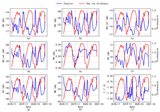 Since some samples may have local incidence angles around 33°, HH and HV do not need to be normalized, and normalization will introduce errors, so the unnormalized features (HH and HV) were added. In Figure 11, the X-axis is the date, the left Y-axis is the characteristic value, and the right Y-axis is the sea ice thickness value. The blue line represents the change in the characteristic value, and the red line represents the change in thickness value. It can be seen from Figure 11a,b that the characteristic values for HH and HV also peak when the sea ice thickness reaches the trough interval. This is because radar signals from HH and HV polarization patterns can penetrate sea ice better when it is thinner. HH polarization constitutes horizontal emission and reception, both being parallel to the sea ice surface and more susceptible to surface roughness and therefore more sensitive to sea ice thickness. The cross-polarized HV is less affected by the sea state and has certain advantages in distinguishing the boundary of seawater and sea ice (with a smaller thickness value).