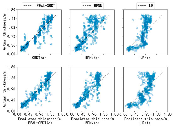 As shown in Figure 12, in the extrapolation experiment, the resulting plots for the GBDT, BPNN, and LR models that were not paired with active learning are shown in Figure 12a, Figure 12b, and Figure 12c, respectively, and those with active learning are shown in Figure 12d, Figure 12e, and Figure 12f, respectively. Some samples contain highly similar feature information, which leads to a redundancy of feature variables and reduced separation of sea ice type and thickness, so the prediction results are clustered together. In Figure 12a, this phenomenon exists between 36 cm and 72 cm on the Y-axis, where the blue points are concentrated in one block. Active learning is used to select the samples with the largest standard deviation, and the samples with larger standard deviations have higher uncertainty and contain higher information entropy, as shown in Figure 12d, reducing the occurrence of this phenomenon, and the same is true for Figure 12e,f.