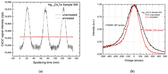 The relative Cd SIMS intensity (a) of and XRD rocking curves (b) of the as-grown and annealed Hg1−xCdxTe (x = 0.37) layers.
