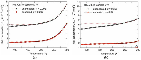 Hall electron concentration versus temperature for the Hg1−xCdxTe Sample MW (a) and Sample SW (b), measured after growth and after additional annealing. Experimental results (points) and fitted calculated lines for homogeneous layer.