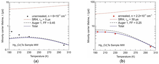 Measured and calculated minority carrier lifetime versus temperature for the Hg1−xCdxTe Sample MW layer after growth (a) and after additional annealing (b).