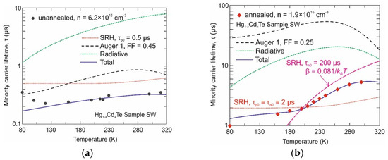 Figure 4 and Figure 5 show the experimental dependence of minority carrier lifetimes on temperature for the Hg1−xCdxTe epilayer with x = 0.29 (Sample MW) and x = 0.37 (Sample SW), respectively. The evolution of time response with temperature is characteristic of each recombination mechanism. Radiative, Auger 1, and non-fundamental Shockley–Read–Hall (SRH) recombination processes were considered in the theoretical analysis (see Appendix A). For the unannealed Sample MW (with residual composition inhomogeneities), the minority carrier lifetime is limited by the Auger 1 recombination. This is probably due to high intrinsic concentration at high temperatures and high background donor doping at temperatures < 250 K. In the case of the unannealed Sample SW, all three effects determined the minority carrier lifetime. Discrepancies between the theoretical results and those calculated at lower temperatures may result from similar discrepancies in electron concentration (see Figure 2). It has to be noted that theoretical analysis assumes uniform material and thus may not be sufficient for the material with residual compositional inhomogeneities. Auger 1 recombination strongly depends on electron concentration and thus it is expected to be partially suppressed by lower background doping after additional samples’ annealing. In the narrow bandgap material (Sample MW), the intrinsic concentration at high temperature is significantly higher than the background doping. Thus, the increase in carrier lifetime due to composition homogenization is not only due to reduced background donor doping (increased Auger 1 lifetime) but mainly due to a significant increase in the SRH lifetime. After additional annealing, τp0 increases from 5 μs to 30 μs. The SRH mechanism determines the carrier lifetime in the annealed Sample SW and is much shorter (by an order of magnitude) than in the annealed Sample MW. However, what is worth pointing out is that it has a strong temperature dependence. Thus far, the SRH lifetime calculated using Equation (A8) is valid only for neutral defects, i.e., when τp0 = τn0. This approach causes an underestimation of the minority carrier lifetime temperature > 200 K (Figure 5b). A good agreement of the total carrier lifetime was obtained, assuming a temperature-dependent SRH lifetime above 200 K. According to Equation (A10), τn0 >> τp0 and equals to 200 μs, and the effective energy trap level lies of about 81 meV above the edge of the valence band. In an n-type semiconductor, the SRH lifetime is temperature dependent for strongly charged acceptor defects [28].