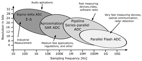 Several AD converter topologies vary regarding conversion, resolution, sampling rate, structure size, price, and the main purpose of the mentioned applications [12,13,14,15,16,17,18,19,20]. A brief graphical overview of the topologies, depending on the sampling rate, resolution, and purpose is shown in Figure 1 [11].