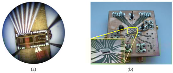 To achieve the highest possible sampling rate, the clock distribution is divided into four blocks. The individual repeaters need to be placed as close as possible to the aforementioned D-flip-flop circuits. The output of the converter is represented by a thermometric code. Two CMOS inverters connected in series are used as output circuits. The output circuits directly decouple the flip-flop circuits and also provide sufficient excitation of the other circuits connected to the AD converter. The output is compatible with the −3.3 V LVCMOS standard [29]. The AD converter is implemented with additional circuit structures on a 2000 × 2000 μm chip. The core of the AD converter occupies an area of 1000 × 350 μm and the entire area of the structure, including the bonding contacts, is 2000 × 700 μm. The converter chip is contacted directly on the test PCB; see Figure 8a.