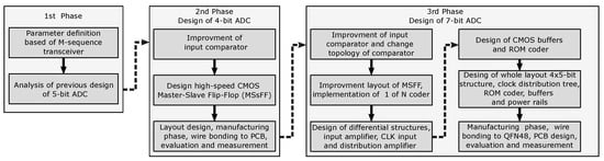 Building on the knowledge from the initial design of a 5-bit AD converter and the requirements of the proposed UWB M-sequence system, the design process for the individual circuit structures of the new AD converter started. First, a test 4-bit structure was designed to evaluate the concept of the proposed AD converter structure for specific UWB M-sequence systems. After confirming its sufficient characteristics, a 7-bit AD converter was designed for possible applications based on the requirements of UWB M-sequence systems. A flow chart showing the history and design workflow of the aforementioned AD converters is shown in Figure 4.