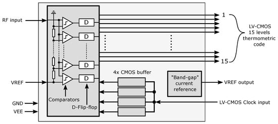 where N is the number of bits of the AD converter. As can be seen from the above result, the decision level reached values of 100 mV in the case of a 4-bit AD converter, which did not make it difficult to process tens of MHz where the comparator gain provided sufficient output switching. Based on Equation (2), the LSB decision level for a 7-bit converter and a 1.5 V reference voltage is around 11.7 mV. If it were necessary to reduce the reference range to 1 V, the LSB decision level would be around 7.8 mV.