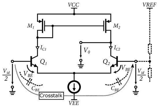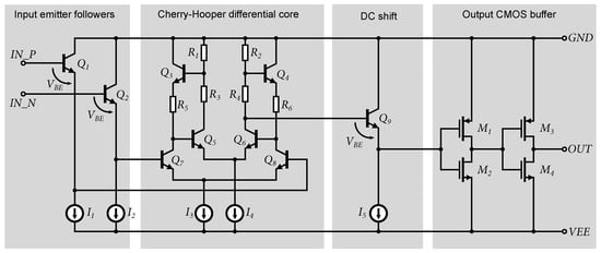 This problem is described in more detail in the literature [34]. Compared to the original 5-bit version of the ADC, the topology of the comparator has been replaced [16,33]. The comparator used in the 4-bit test cell consists of two differential amplifiers: a bipolar amplifier and a CMOS connected in series. An emitter follower is used as the input to maintain a high input resistance in the comparator and to shift the input voltage by the value of VBE. To achieve high gain, an active load was used. Figure 6 shows the circuit of a bipolar differential amplifier with an active load.