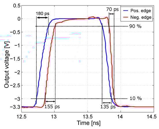 All synchronization and digital circuits are based on CMOS structures, which reduce the power consumption of the entire converter structure. The CMOS Master–Slave D-Flip-Flop (MSFF) circuits are used for synchronization [37,38]. The MSFF circuits synchronize the output of the comparators to the falling edge of the clock signal. Synchronization to the falling edge of the clock signal was deliberately chosen because this MSFF circuit topology achieves higher slew rates and higher speeds for the same output load. This is an acceleration of 120% for the rising edge and almost 200% for the falling edge; see Figure 7. This performance enhancement is due to the MSFF topology with synchronization to the falling edge, which features two CMOS inverters connected in series at the output, which increases the gain and the slew rate, and better forms the signal for the other circuits. In the case of rising edge synchronization, the output signal is taken from the first inverter [39].