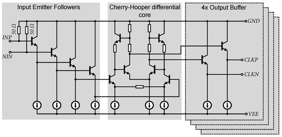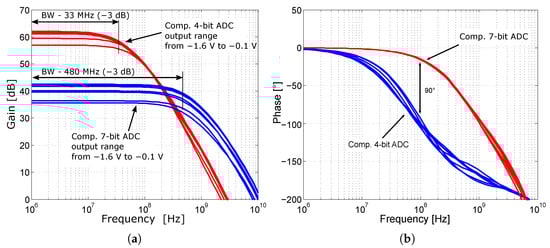 The comparator includes an input buffer composed of emitter followers that separate the impedance of the input, thereby increasing the input impedance and simultaneously shifting the input signal by the value of VBE to adjust the operating point of the comparator. The core of the comparator consists of a Cherry-Hooper differential stage with active feedback [50,51]. The gain of the comparator’s differential stage was set at 42 dB as a compromise to maintain consistent switching characteristics over a bandwidth of at least 400 MHz. A comparison of the gain and bandwidth of the two versions of the comparators is shown in Figure 12a.