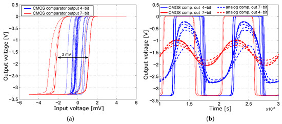 Reducing the comparator gain increases the minimum LSB decision level to 2 mVpp and the maximum hysteresis to 3 mV; see Figure 13a. The hysteresis is two times worse than the original comparator, but it is more stable over the entire input range of the comparator. The adjustment of CMOS output transistors also increases the comparator slew rate. A summary and comparison of the main parameters of the comparators for the 4-bit and 7-bit ADC are presented in Table 2.