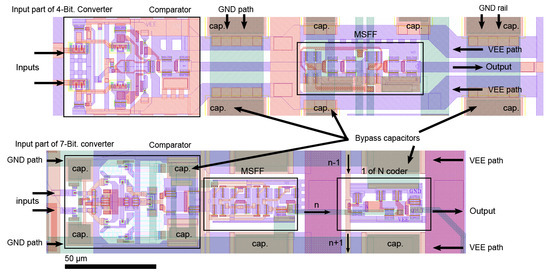 Figure 15 shows the on-chip layout and comparison of the input parts of the 4-bit and 7-bit ADCs. It is also possible to see the miniaturization of the entire structure, along with the addition of a 1 of N encoder.