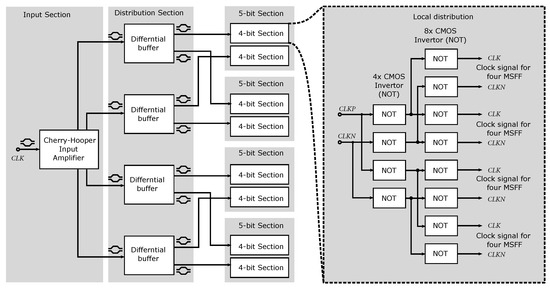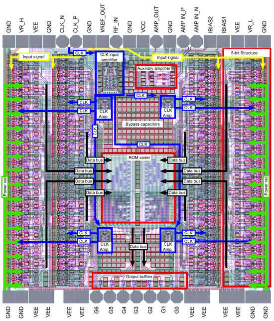 The AD converter consists of a so-called core, where the individual comparators and synchronizing D flip-flop circuits are located. The resistor network has both main nodes VR_H and VR_L routed out, through which, the upper and lower reference voltages can be controlled within the input range of the comparator. For output data compatibility with existing standards and FPGA connectivity options, the converter includes an encoder to convert the thermometry code to Gray code. This encoder consists of a 1 of N encoder and an encoder to the Gray code operating on the principle of ROM [30,34]. With an increase in structure size, the clock signal distribution network with differential inputs is also extended. The converter itself only has a non-differential input RF_IN for direct control and measurements, but also a standalone differential amplifier has been added to the AD converter chip. The output of the amplifier can be connected via the PCB trace to the input of the converter. This solution can provide differential excitation of the AD converter if needed.