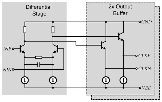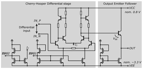 where is the current gain of transistors and are the output resistances of transistors and [35,36]. In 0.35 µm SiGe BiCMOS technology, the PNP transistor structure is not supported, so PMOS transistors are used. A CMOS differential stage is used as the second stage because it better tolerates the operating point offset. If a bipolar differential stage is also used in this case, it would be necessary to readjust the operating point using emitter trackers, which would increase the power consumption. The output of the comparator consists of two CMOS inverters that amplify and shape the output signal. To adjust the operating point, current sources with NMOS transistors are implemented. These modifications over the original comparator circuitry increase the input range of the comparator to 1.6 Vpp and the gain of the comparator reaches 62 dB with a frequency bandwidth of 100 MHz (cutoff frequency −10 dB). The power consumption of one comparator reaches 5.75 mW at −3.3 V supply.