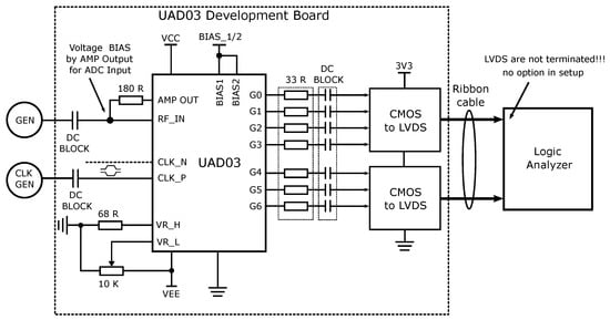 As part of the measurement, two generators (Anritsu MG3700A and Keysight N5183B) were connected to the board for the input and clock signals. The two signals were fed single-ended and DC-decoupled by decoupling capacitors. The necessary power supply and bias voltages were set, e.g., for transistor biasing. The DC bias voltage of the converter was set via the output of the auxiliary differential amplifier to half of the reference voltage. The reference voltages from both the top and bottom sides, for the resistor network, were set using resistors and potentiometers. The output digital signal was acquired by a logic analyzer Tektronix TLA5201b, which was connected to the development board by a bus flat cable. Despite the effort to contribute to better digital signal integrity by using differential LVDS, the logic analyzer did not have a setting for impedance matching of the LVDS signal at the analyzer input. However, it was still able to analyze the individual logic levels. The output data were saved and processed using AD converter analysis scripts in Matlab and LabVIEW [64] environments.