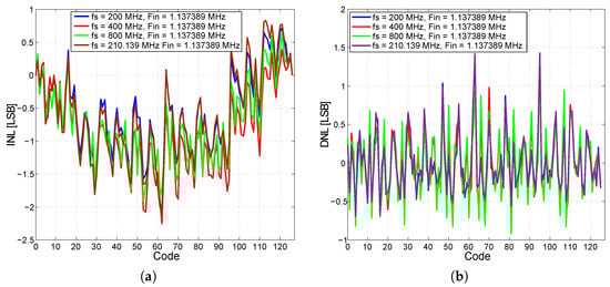 In such a measurement scenario, the converter achieves an effective number of bits, ENOB = 6.4 bits, a signal-to-noise and distortion ratio, SINAD = 36.54 dB, the strength ratio of the fundamental signal to the strongest spurious signal in the output, and the parameter spurious-free dynamic range, SFDR = 42 dBc. From the excited signal measurements and historiographic analysis, the integral and differential nonlinearities of the AD converter at different input sinusoidal signal frequencies and sampling frequencies were found. The results of the nonlinearity measurements are shown in Figure 27. The integral nonlinearity INL is a maximum of the 2-bit LSB and the differential nonlinearity DNL is a maximum of the 1.5-bit LSB. In these measurement scenarios, the converter was not equipped with a T&H input sampling circuit, which may have contributed to inferior results when compared to similar converters described in [65,66,67,68]. Calibration has not yet been performed on the presented converter. After calibration, the converter should exhibit significantly improved performance. The converter has also been tested for a maximum sampling rate, which reaches 1.4 Gs/s. The measured power consumption at 20 Ms/s is 1050 mW and at 1.4 Gs/s is 1290 mW, with a power supply of −3.3 V. A summary of the important parameters of the presented ADC and a comparison with other ADCs is presented in Table 3.