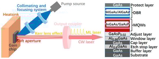 Schematics of the Kerr-lens mode-locked VECSEL (left) and the epitaxy structure of the employed gain chip (right).