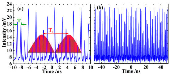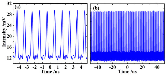 Further fine tuning of the laser resonator can transform the above disordered pulses into a regular and orderly pulse sequence, i.e., enforce the laser operating at a stable CW mode-locked status, which can be verified from Figure 4. Figure 4a indicates the mode-locked pulse train within 10 ns, where the amplitude of each single pulse is basically the same, and the time interval between pulses is slightly less than 1 ns. Figure 4b shows the pulse train on a larger time scale. Since the amplitude of the pulses shows good equality and uniformity in more than 100 basic cycles shown in the figure, it can be regarded that the laser is in a stable CW mode-locking state.