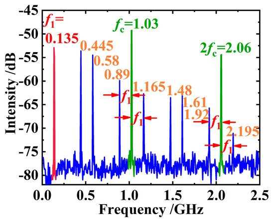 At this time, the signal appearing on the RF spectrometer is plotted in Figure 3. It can be found that although the spectrum is chaotic in general, some spectral lines still have a clear significance. For example, in Figure 3, the line fc = 1.03 GHz corresponds to the pulse fundamental frequency determined by the length of the resonant cavity, that is, to the pulse period Tc in Figure 2a. Naturally, the line 2fc = 2.06 GHz is the second harmonic of the fundamental frequency of the pulse. As for the first line f1 = 0.135 GHz in Figure 3, we speculate that it may be caused by a relatively regular modulation embedded into the chaotic pulses, for example, by the pulse amplitude modulation marked by the red color block in Figure 2a, that is, by the period T1 in Figure 2a. The lines on the left and right sides of 1.03 GHz in Figure 3 are obviously the difference- and sum-frequency of fc and f1, respectively. Similarly, the lines on the left and right sides of 2.06 GHz are the difference- and sum-frequency signals of 2fc and f1. The meanings of the other spectral lines in Figure 3 are still unclear.
