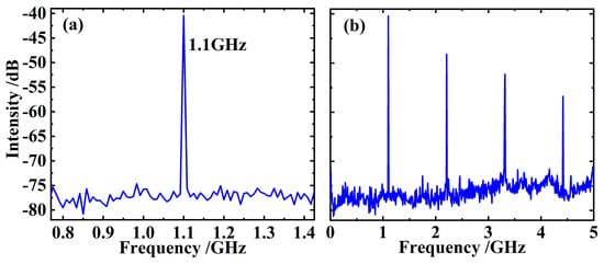In order to meet the mode-matching between the laser and the pump spot on the gain chip, so as to reduce the thermal effect and improve the electro-optic efficiency of the laser as much as possible, the length of the laser resonator is chosen to be about 136 mm in this experiment. Figure 5a presents the RF spectrum of the CW mode-locked pulse train, indicating a fundamental pulse repetition rate of 1.1 GHz, strictly corresponding to the length of the resonant cavity used in our experiment. Some higher-order harmonics of the fundamental frequency signal are given in Figure 5b, and its clarity is in distinct contrast to Figure 3.