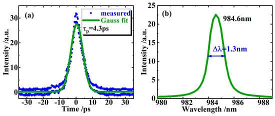 Autocorrelation trace of the CW mode-locked pulses and its Gaussian fitting (a). The measured laser spectrum (b) indicates an FWHM of about 1.3 nm at 984.6 nm wavelength.