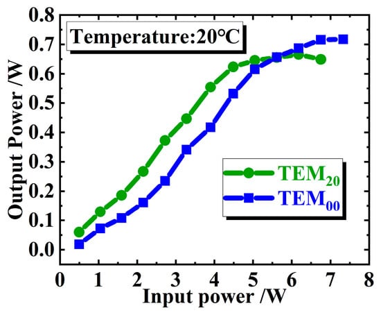 Obviously, the advantage of a laser with multi-transverse modes is that it can increase the mode volume of the laser in the gain medium and thus increase the output power of the laser. Figure 9 shows the output powers of our CW mode-locked VECSEL with TEM00 and TEM20 mode, respectively, when the temperature of the heat sink bonded to the gain chip is 20 °C. As can be seen from Figure 9, the output power of the laser with TEM20 mode is larger than that of TEM00 mode when the incident pump power is below 5.6 W, just as we expected. However, this advantage is not so significant in the experiment. In fact, the maximum output power of the laser with TEM00 mode (716 mW) is bigger than the maximum output power of the laser with TEM20 mode (666 mW), because the thermal rollover of the laser with TEM20 mode occurs earlier. The above phenomenon is understandable, since the diffraction loss of a laser with higher-order transverse mode is relatively larger, and for a laser with small gain, like the VECSEL used in this work, it means lower efficiency and a greater thermal effect; hence, thermal rollover occurs earlier.