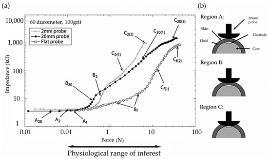 The tactile sensor array with three regions; (a) impedance (log scale) as a function of force (log scale) applied normally to the electrode surface. Textured silicone: 60 durometers, 100 grit size. (b) Graphic correlating curve shapes to probe indentation (2 mm probe shown). Reproduced with permission from [Nicholas Wettels], [Advanced Robotics]; published by [Taylor & Francis Group] (2008) [44].