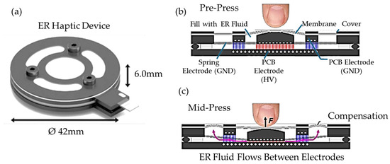 Schematic and working principle of a cylindrical ER device in which a user presses upon the membrane surface; (a) form factor of the ERF-based haptic device (cross-section view of the working principle of the cylindrical haptic actuator), (b) pre-press, (c) mid-press. Reproduced with permission from [Ping Sheng], [Annual review of fluid mechanics]; published by [Annual Review], (2011) [52].