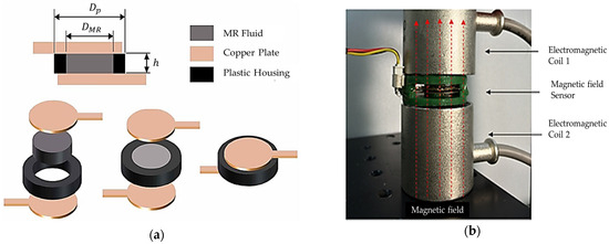 Configuration of the flux measurement sensor; (a) configuration of the MRF-VR system, (b) photograph of the measurement system in magnetic field calibration unit [60,61]. Reproduced with permission from [Suresh Kaluvan], [International Journal of Mechanical Systems Engineering]; published by [Graphy Publications], (2015), (b) Reproduced with permission from [Suresh Kaluvan], [Sensors and Actuators A: Physical]; published by [Elsevier], (2016).
