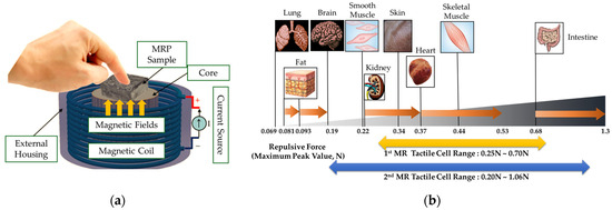 Tactile force sensor and sensing spectrum; (a) schematic of MRP sample, (b) force spectrum of MRP tactile device [66,67].