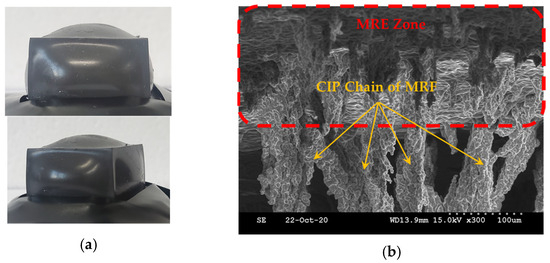 Dynamic sensor mimicking human organs; (a) fabricated sensor sample, (b) the microstructure inside of the sensor—the shape of the MRF chains extending from the MRE [69].