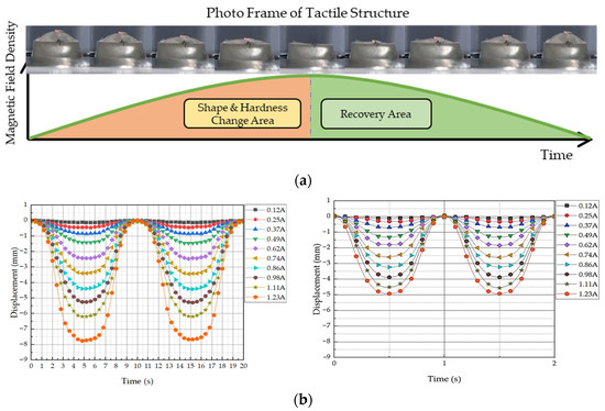 Dynamic motion tactile sensing device; (a) schematic of dynamic shape by the input magnetic field, (b) the field-dependent dynamic motion results in 0.5 Hz of excitation [69].