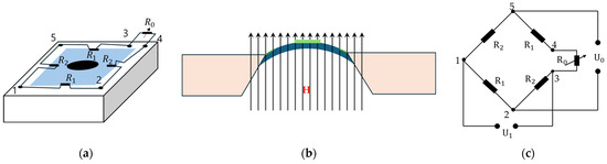 Schematic configuration and working principle of the magnetometer based on a MRE; (a) schematic diagram of magnetic sensor, (b) the sensor’s cross section indicating the direction of the magnetic field H, (c) circuit diagram of the Wheatstone bridge [76].