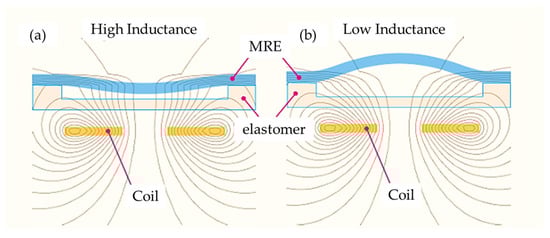 Working principle of the inductive sensor with flat coils [82]. (a) high inductance with a small deformation of the MRE skin, (b) low inductance with a large deformation of the MRE skin. Reproduced with permission from [Hongbo Wang], [International Conference on Soft Robotics (RoboSoft)]; published by [IEEE], (2009).