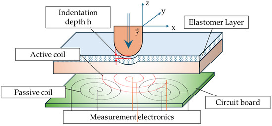 Shabdin et al. [83] proposed a graphite (Gr)-based MRE (Gr-MRE) to evaluate the effect of Gr to the resistivity under applied forces and magnetic fields. It has been found from this evaluation that two relationship curve resistances (R) under different applied forces (F) and different magnetic fields (B) are obtained. Then, it has been identified from the relationship curves that the presence of a Gr fraction arrangement contributes to the conductivity of the Gr-MRE and the field-dependent modulus can be improved, particularly at low strain amplitudes, compared with conventional MRE without the addition of Gr. In addition, from the relationships between force and field-dependent resistivity, the Gr-MRE can be one of potential force sensors. Gast and Zimmermann [84] investigated the capability of a tactile sensor using a MRE, especially to determine the position of indentation by measuring the inductance of multiple planar coils and a soft magneto-sensitive layer. Figure 14 shows the working principle of the proposed tactile sensor with the magnetic circuit coil board. In the figure, the indentation of depth h is the negative z direction and hence the indentation is in a certain interval of the x and y position. The inductance of the magnetic coil is increased by increasing the magnetic flux intensity, and the variables of h, x and y are changed or controlled. Therefore, the inductance change curve of a planar-shifted indentation with a constant depth of h can be determined by identifying the peak value (or resonance) of the induction change from the measurement electronics, which is the inductance-to-digital converter operating in a single channel mode which ensures an adjustment of the frequency to maintain the resonance in the sense of the inductance change. Khalid et al. [85] proposed a three-axis inductive tactile sensor using a MRE which is applicable to surgical robotic systems. Figure 15 presents the schematic configuration of the sensor and working principle. The sensor consists of copper coils on a printed circuit board and patterned elastomer layer between the marker and coils where the marker is the mixture of a material with high magnetic permeability and the elastomer. The markers and coils are separated by a layer of the elastomer such that there is an initial gap between the coils and markers. When a force is applied on the sensor’s surface, the marker displaces from the initial position, changing either the overlap area between the marker and the coils or the distance between them. This change in the position of the marker causes a change in the resonance frequency of the LC circuit through which the inductance is calculated. Therefore, the applied force can be estimated by measuring the change in the inductance values. It is noted that the direction of the applied force can be also identified by configuring the positions of the coils. Tasin et al. [86] made a new type of MRE to enhance the storage modulus, magnetostriction magnitude and reaction (normal) force to investigate a potential application of the proposed MREs as sensors or sensing devices. The proposed MRE samples consist of a polydimethylsiloxane (PDMS) silicone rubber and high CIPs which have an average diameter of 5 mcm with a spherical shape to have specific characterizations including high saturation magnetization, high permeability, high normal force and low remanent magnetization. It has been shown that the target specifications are achieved from experimental measurements and it is noted that force sensors and pressure sensors could be devised based on the results presented in this work, since moderate stiffness (or midrange modulus) could ensure the high durability of the sensors while maintaining sufficient magnetostriction magnitude. Costi et al. [87] presented the first case of a 3D-printable self-sensing MRE and tested cyclic mechanical compression and tensile mode analysis at a high deformation rate up to 20%. The MRE samples containing the styrene-based thermoplastic elastomer (TPS) were fabricated at 0.5–2.0 Tesla. In addition, carbon black (CB) fillers were added to have two properties of the MR effect and piezoresistive effect, providing a self-sensing capability. It has been shown that several properties including the magneto-resistive, magneto-strictive and hall effects could be achievable by selecting optimal ratios between the CIP concentrations and amount of the fillers as a function of the magnetic field. Therefore, various types of self-sensing devices which have diverse shapes can be simply made from the 3D printing technology.