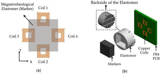 Schematic design of a three-axes inductive tactile sensor; (a) top view of MRE sensor (b) exploded view of MRE sensor [85]. Reproduced with permission from [Muhammad A. Khalid], [IEEE Sensors Journal]; published by [IEEE], (2022).