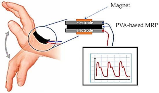 Recently, a magneto-sensitive viscoelastic polymer consisting of low cross-link polyurethane (PU) and magnetic particles, called a magnetorheological plastomer (MRP), has been actively studied in the sense of the development of an enhanced MRP and its various applications, especially sensor applications. Xu et al. [88] experimentally investigated the flow motions operated under the squeeze flow mode of a MRP, including the elastic deformation region, stress relaxation region and plastic flow region. It was found from this work that the field-dependent compressive and tensile yield stress are sensitive to the magnetic field, which provides a possibility of the sensor fabrication of the proposed MRP consisting of a CIP and plastic polyurethane matrix. Xuan et al. [89] surveyed the state-of-art on the science and technology levels of the MRPs. Several different types of MRPs were introduced and their field-dependent characteristics were discussed in the sense of their application as sensors. The types of MRPs are classified by the mixing materials (matrix): silica gel, polymer gel, hydrogel, cross-linked polyurethane, triblock copolymer polystyrene and petroleum jelly. In addition, several properties of MRPs such as deformable shape, field-dependent conductivity and MR effect depending on the magnetic field were discussed for various applications as actuators or sensors. Xu et al. [90] proposed a new MRP whose resistance can be controllable and hence can be used as a strain sensor. As a first step, a carbon filler doped MRP samples with carbon micro-fibers, carbon nanotubes and their mixtures were made to observe both the ME effect and magnetic field-dependent electrical property. It has been shown that the vibration range of the resistance is increased by increasing the oscillation amplitude and the period of the resistance is half of the period of the strain, showing possible application to multifunctional properties including sensors. Qi et al. [91] developed a versatile MRP based on polycaprolactone (PCL) and thermoplastic polyurethane (TPU) which can have 3D printability, switchable mechanics, shape memory and self-healing properties. After characterization of the proposed MRP, several features, which are achievable features of the proposed MRP such as static and dynamic viscoelasticity, shape memory property and self-healing properties, were presented and discussed. Hapipi et al. [92] proposed a new type of MRP based on polyvinyl alcohol (PVA-based MRP) which possesses an excellent MR effect which is a potential candidate as an actuator. In addition, the proposed MRP produces a shear stiffening (ST) effect which is very beneficial in fabrication pressure strain sensors. The PVA-based MRP exhibits an ST behavior, which is a common phenomenon in which the viscosity increases when the materials are exposed to external stress beyond their critical shear rate. Both excellent flexibility and conductivity are good properties to fabricate pressure strain sensors. Figure 16 shows the schematic of the pressure or strain sensor to detect human wrist motions like bending and stretching utilizing the PVA-based MRP. Since MRP is flexible, it can be applicable to several soft systems where the pressure strain needs to be sensed as an output or a feedback signal in the closed loop control systems. Xu et al. [93] proposed a flexible self-powered magnetism/pressure dual-mode sensor consisting of a MR plastomer (MRP) in which the proposed pressure sensor is sensitive to a slight pressure (1.3 kPa) as well as responsive to a small magnetic field (12 mT). The working mechanism of this sensor is based on the displacement reaction of Fe and CuSO4, and the micro-scale carbonyl iron (CIP) in the MRP electrode aggregates into the chain-like structures resulting in the enhancement of the electrochemical activity of ions in the electrolyte of the electrode materials. Zaini [94] used a graphite to fabricate a MRP which has a sensing capability owing to its flexibility, soft nature, responsiveness to external magnetic field and conductive electricity. The main goal of this work was to investigate the electrical properties of MRPs such as the conductivity absolutely required to use them as potential sensors. It has been found from experiments that the conductivity of 10 wt.% graphite is increased up to 178.06%, which is the highest at a magnetic flux density of 400 mT compared to without the graphite. The wide change in the conductivity and the sensitivity of the proposed MRP depending upon the magnetic field intensity can contribute to the potential applications of the sensing detection devices. Hapipi et al. [95] fabricated the polyvinyl alcohol (PVA)-based MRP to enhance the MR effect as well as shear stiffening (ST) effect by the magnetic field. After the fabrication of several samples by varying the solvent ratios of the binary solvent mixture dimethyl sulfoxide (DMSO) to water, the field-dependent properties were tested. It has been identified that the MR and ST effects are dependent on the solvent ratios and hence appropriate actuators and sensors could be devised by adjusting both the field intensity and solvent ratios. Amlee et al. [96] proposed a hydrogel-based MRP (HMRP) with a certain amount of the graphite to use as a force sensor. In this work, HMRPs with 0 wt.% up to 15 wt.% were prepared and tested under applied forces ranging from 0 N to 5 N. It has been shown that the force can be measured from the resistance change of the HMRP with and without the magnetic field for practical feasibility in the medical area for physiology or therapy. Pang et al. [97] fabricated a new type of MRP using a series of hollow powders (HGP) to enhance the impact resistance of the material and dynamic compressive properties under a high strain rate. It was shown that the magnet-induced yield stress increased from 7.3 MPa to 17.1 MPa by adding 9 vol.% CIP. However, it was also found that this benefit could not be achieved