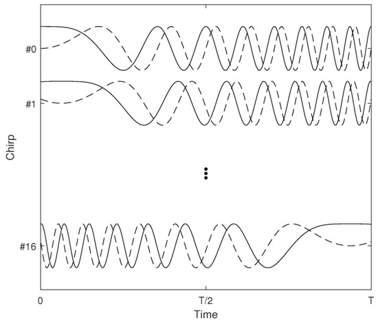 The chirp waves as shown in Figure 1. Solid lines represent in-phase components and dashed lines represent orthogonal components.