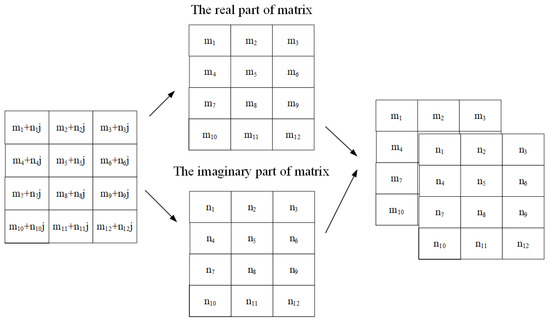 There is one more thing that needs to be dealt with before model training: the matrices processed by the VDSR network are real values, whereas the CFR matrix is a complex matrix. Inspired by the processing of multi-channel color images by VDSR, the complex matrix is converted into a two-channel real matrix, as shown in Figure 7. After training, the output CFR matrix completes high-precision interpolation and noise reduction at the data positions, which is the prediction of the real CFR matrix.