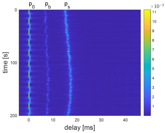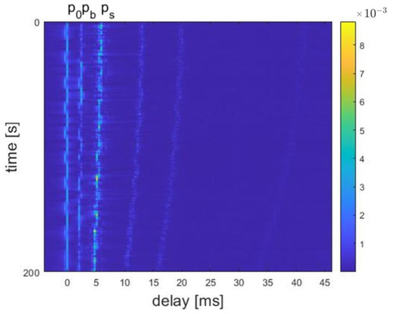 The channel delay plots at distances of 300 m, 800 m, and 3000 m are shown in Figure 11, Figure 12, and Figure 13, respectively. For example, Figure 12 shows a clear multipath structure of the channel, primarily manifested in the five arrival peaks of the signal. The channel remains overall stable with slow temporal variations, consistent with the characteristics of shallow water channels. The number of arrival peaks at 300 m is fewer than at 800 m, while the number of arrival peaks at 3000 m is greater than at 800 m.