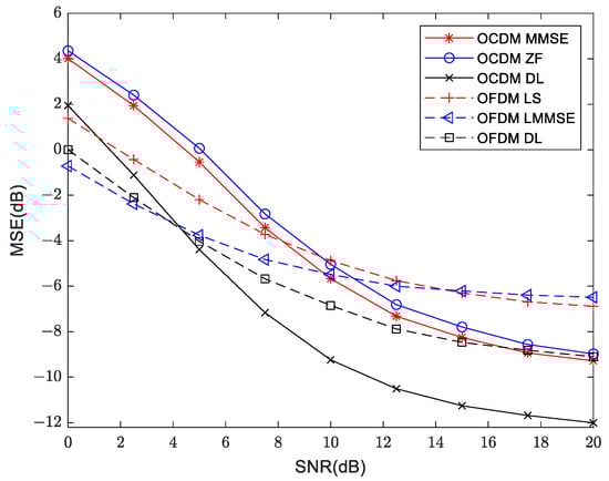 The mean square error measurement at 300 m and 3000 m are shown in Figure 16 and Figure 17, respectively. It can be seen from the three sets of channel models that the lower limit of MSE for OCDM is lower than that for the OFDM system, and using deep learning can reduce the lower limit of MSE for both OFDM and OCDM.