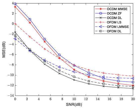 In this section, in order to test the performance of VDSR in channel estimation, BER and MSE are used as reference indicators to compare with traditional channel estimation methods of OCDM and OFDM systems. The frame structure of OFDM and OCDM are shown in Figure 9, the purpose of a preamble sequence in signal transmission is to facilitate synchronization and timing at the receiver, and is the time interval between the preamble sequence and the data.