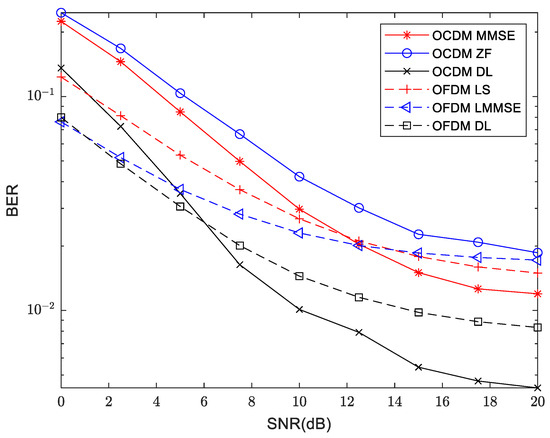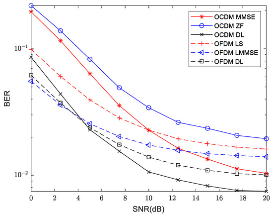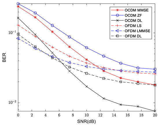 In the experiment, a number of different equalization methods are investigated to evaluate the performance of the proposed VDSR channel estimation system. OCDM MMSE and OCDM ZF represent channel equalization using the channel state information obtained by MMSE and ZF channel estimation algorithms for OCDM communications, respectively. Similarly, OFDM LMMSE and OFDM LS represent channel equalization using the channel state information obtained by LMMSE and LS channel estimation algorithms for OFDM communications, respectively. OFDM DL and OCDM DL represent the equalization of the channel estimated by the enhanced super resolution model VDSR for OFDM and OCDM, respectively.