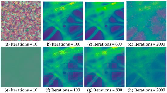 In our experiments, we use the network parameters: A 3-depth U-Net with 1 input channel and 64 channels in the first layer; we use padding to the 3 × 3 convolution layer, meaning that we do not change the height and width of the feature layers [40]. Since the feature layer size is not changed after convolution, the two feature maps can be directly stitched together, so there is no need for center cropping, and the final obtained convolution layer height and width are kept the same as the input convolution layer height and width. The number of iterations is set to 3000, and the image is saved every 100 iterations.