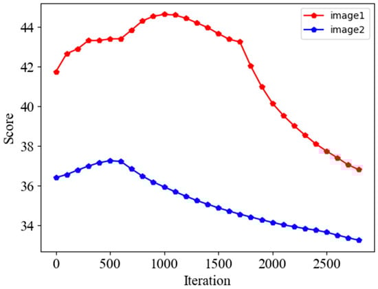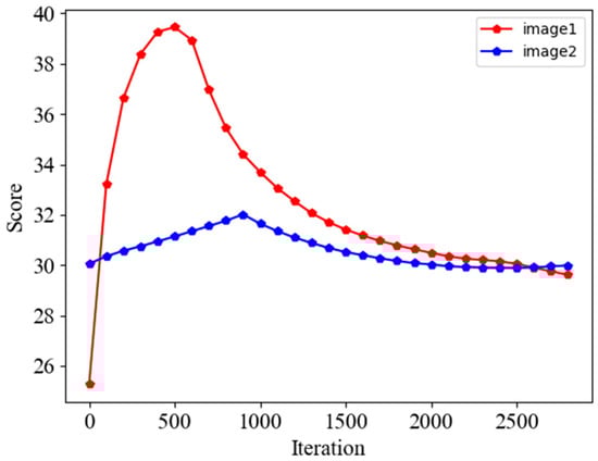 Figure 8. The trend of the scores of the two datasets of pCLE after passing through the two networks is increasing and then decreasing for all two images, and the number of iterations to reach the maximum score is different.